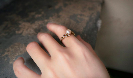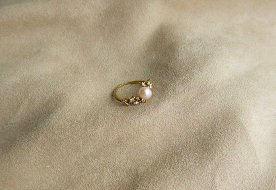 春分新生 雙葉環抱珍珠戒指 手工復古黃銅